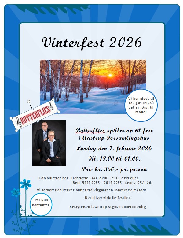Aastrup Sogns Beboerforening af 1983 NU ER DER BILLETTER TIL VINTERFEST - RING BENT 20142265 el. HENRIETTE 22132399 Formålet med foreningen er at drive, Aastrup Forsamlingshus.Foreningen blev dannet af en kreds af lokale beboere i 1983.Den blev dannet for at holde liv i lokalsamfundet, og derved holde fast i de lokale traditioner.Foreningen har en kontrakt med Guldborgsund Kommune om at vedligeholde det indvendige,og til gengæld står kommunen for det udvendige, såsom snerydning og lignende opgaver.